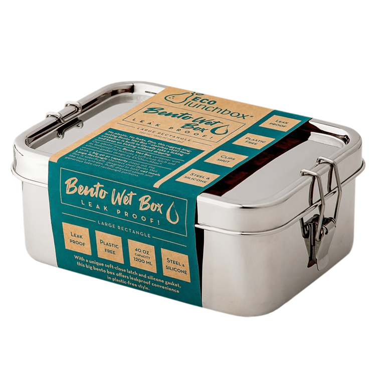 Geen plastic én geen lekken. Bovendien is deze robuuste, duurzame Bento Wet Box™ roestvrijstalen voedselcontainer gemaakt om letterlijk tegen een stootje te kunnen. Onze plasticvrije Bento Wet Box-container met lekvrij deksel is voorzien van een zacht sluitende vergrendeling en een siliconen pakking van ECOlunchbox®. Speciaal ontworpen om ook vloeibare maaltijden in te bewaren, zoals hoofdgerechten met saus, luchtige salades of royale meeneemporties uit een restaurant.